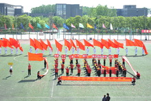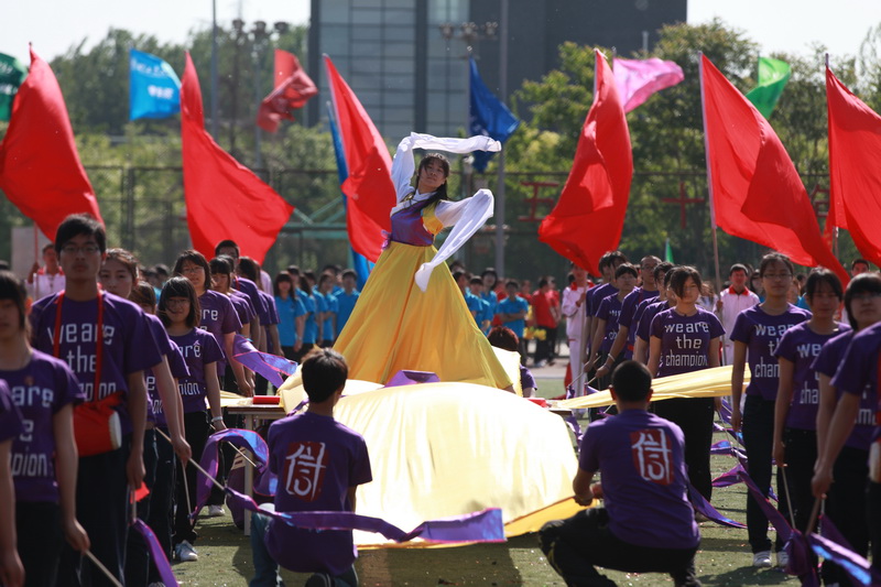 手持黃花,步伐鏗鏘,院旗飄揚(yáng),研究生部的學(xué)生們出現(xiàn)在了操場(chǎng)上。他們成熟穩(wěn)重,在賽場(chǎng)上揮灑出別樣的豪情。最后,他們高舉“賀中國(guó)共產(chǎn)黨建黨九十周年”的字板,圓滿地結(jié)束了本次運(yùn)動(dòng)會(huì)的啦啦操表演。