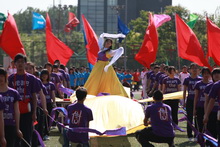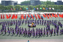 作為衛(wèi)冕冠軍,計(jì)信學(xué)院這次志在三連霸。在表演的一開(kāi)始,看臺(tái)上就喊出了“計(jì)信健兒勇奪魁”的口號(hào),紅色的腰鼓,紫色的方陣,《黃種人》震撼的伴奏音樂(lè)……計(jì)信學(xué)院這次真是霸氣外露,王者氣息十足。