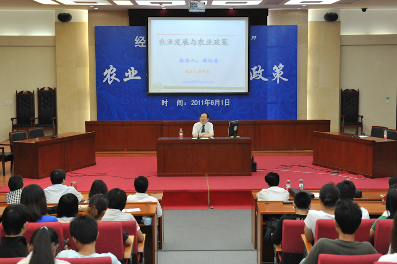 6月1日晚,校長(zhǎng)譚向勇教授以“農(nóng)業(yè)發(fā)展與農(nóng)業(yè)政策”為題在良鄉(xiāng)校區(qū)為經(jīng)濟(jì)學(xué)院近300名學(xué)子作了一場(chǎng)學(xué)術(shù)報(bào)告,同時(shí)也為經(jīng)濟(jì)學(xué)院教授論壇揭開了序幕。