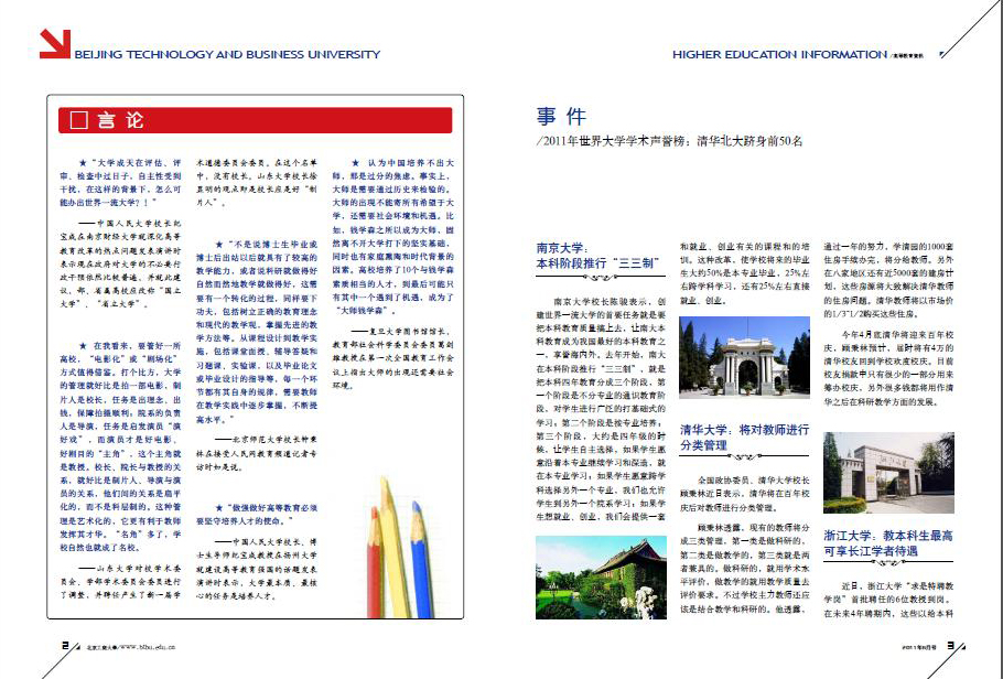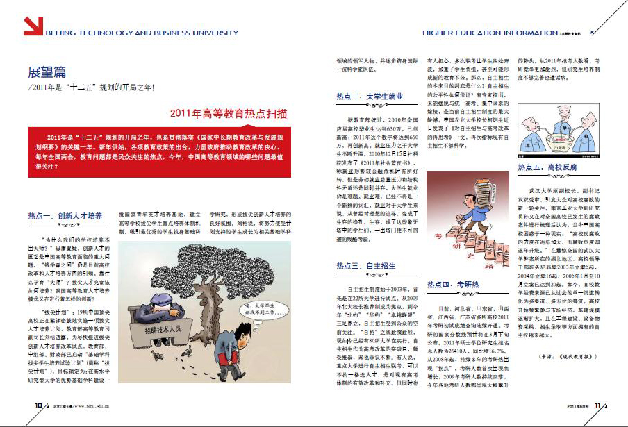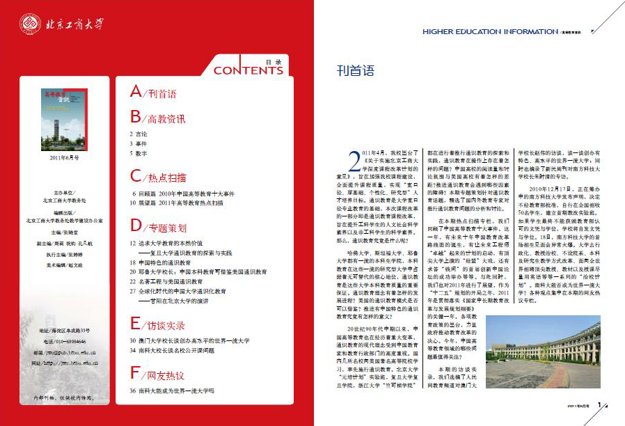 《高等教育資訊》為月刊,以“關(guān)注國內(nèi)外高等教育,傳播先進(jìn)教育理念”為創(chuàng)刊宗旨,主要包括高教資訊、熱點(diǎn)掃描、專題策劃、訪談實錄及網(wǎng)友熱議等專欄,通過不同的觀點(diǎn)言論、熱點(diǎn)事件及數(shù)字新聞等形式來傳達(dá)高等教育的熱點(diǎn)資訊,輔以大量圖片,同時以不同的高教熱點(diǎn)問題為每期專題策劃的討論內(nèi)容,力求印刷精美,內(nèi)容豐富,形式活潑。