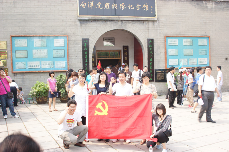 在雁翎隊紀念館前,由黨總支書記李寶仁同志主持,黨員教師面對鮮艷的黨旗,莊嚴地舉起右拳,重溫入黨誓詞。