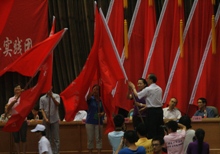 隨后,在激昂奮進的音樂聲中,校黨委副書記盧思鋒親自為各實踐分團授予2011年暑期社會實踐旗幟。13個實踐團代表揮舞著手中鮮艷的旗幟,現場一片熱烈激揚的氣氛,同學們使命感油然而生。