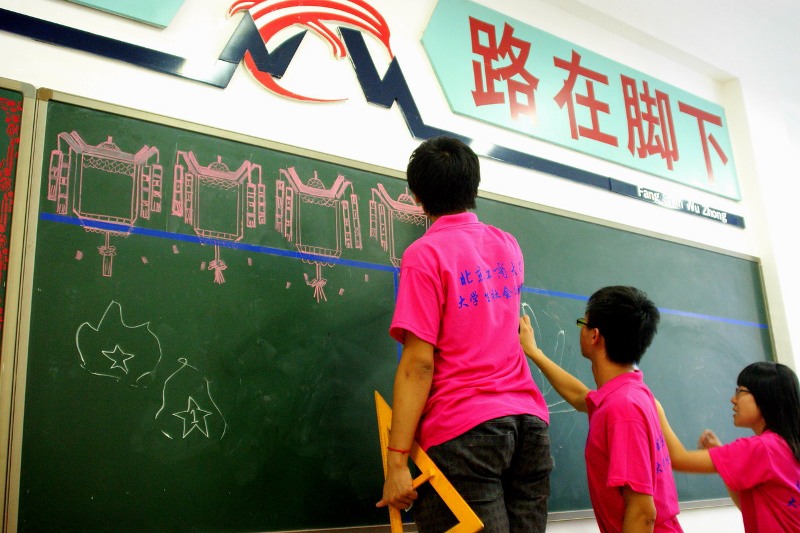 授課之余,老師帶領著同學們為各自的班級繪制黑板報,班名、班徽、班級口號在黑板上一一呈現,斑斕的色彩中融入了他們美好的夢想以及對黨的熱愛,也包含了我們美好的祝愿。