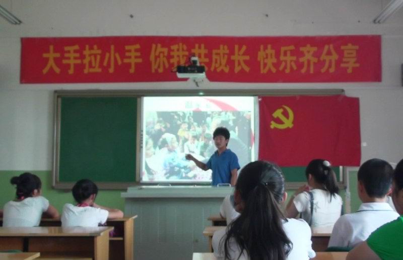 支教組的張?jiān)讫埻瑢W(xué)為孩子們講授了黨史知識(shí)。他并沒(méi)有用刻板的理論知識(shí)來(lái)授課,而是運(yùn)用典型人物的典型事例讓孩子們能有更加深切的體會(huì)。他首先介紹了我國(guó)的幾位著名的總理。無(wú)論是鞠躬盡瘁,死而后已的周恩來(lái)總理;還是運(yùn)籌帷幄,堅(jiān)守原則的朱镕基總理;亦或是奔走前線,一心為民的溫家寶總理,都給孩子們帶來(lái)極大的感動(dòng)和震撼。特別是講到溫總理在“5.12”特大地震時(shí)為災(zāi)區(qū)人民祈福,最終潸然淚下時(shí),在場(chǎng)的所有學(xué)生都倍受感動(dòng)和鼓舞。有學(xué)生反映說(shuō),以前只知道這些大人物的人名,并不知道有這么多感人的事跡,今天的黨史課讓他們真正懂得了感恩和奉獻(xiàn)。黨史課就在這種感動(dòng)氣氛中順利結(jié)束了。