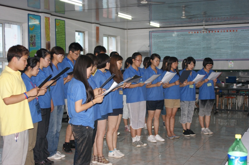 為了能在明天的匯報表演上展示出風采,午飯后,我團在佛子莊體育場進行了第一次也是最后一次彩排。當?shù)啬澄渚俦筷犣s來現(xiàn)場,配合我團同學表演了“三句半”,還演唱了兩首歌曲。同時,西班各莊村村民代表也趕來了體育場,演唱了《小白楊》和《母親》兩首歌曲,透著濃濃的鄉(xiāng)村風情。由于交通不便,活動資源相當缺乏,最后該武警部隊主動向我們提供了物質(zhì)資助,解決了硬件設施的問題。期間,天還下起了大雨,但所有同學都堅持彩排到結(jié)束。