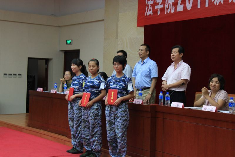 同日下午,領導們出席了在模擬法庭舉行的法學院2011級新生見面會,歡迎124名新同學。法學院院長李仁玉教授為見面會致辭。他從“大學”包羅萬象的詞義本身入手,與同學們探討了應當如何看待社會、看待法學專業和看待四年的大學生活。李院長指出,同學們應當同時看到社會的積極面與陰暗面,從中認識社會、改造社會。李院長還對新生們提出了要珍惜友誼、強身健體、勤于思考、廣泛閱讀和涉獵知識等建議。副院長呂來明教授強調,作為法學專業學生應當關注身邊的熱點,了解社會時事,從法學專業知識的角度切入,靠攏和培養自身對于法律學習的興趣,并逐步形成習慣。辦公室主任管明林老師介紹了學院的領導班子、三個教研室、四個行政辦公室,并簡要介紹了法學院對于學生的培養方案,如專業課、選修課以及每學年各階段的大致教學方案。教師代表劉影老師,在校生代表劉智和新生代表王建飛同學也分別發言。最后,黨總支副書記文四英對學生近期的訓練情況作了簡要總結和點評,對開訓以來榮獲軍訓團先進榮譽稱號的集體進行了表彰。