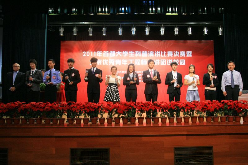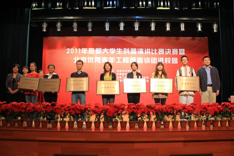 北京市科協(xié)科普部姚儀鸞副部長和團市委大學(xué)部張賀鋒副部長為獲得優(yōu)秀組織獎的學(xué)校頒獎;北京市科協(xié)何素興副主任和北京工商大學(xué)方德英副校長為優(yōu)秀組織個人獎的獲獎單位頒發(fā)了榮譽證書;殷之光老先生和北京工商大學(xué)謝志華副校長為獲得本次比賽一等獎的10名演講者頒發(fā)了獎杯。