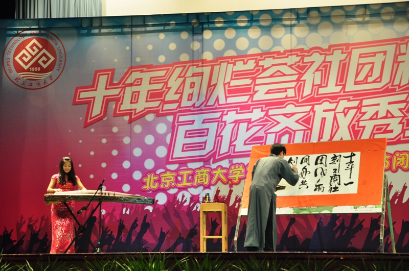 伴隨著街舞社激情飛揚的開場舞,晚會正式拉開序幕。來自我校各社團的17個節目依次出場,展示了他們的風采。激揚的青春、絢爛的夢想在此刻上演。BTBU吉他社用其充滿夢想與激情的樂隊演奏向觀眾們展示了原創音樂的力量;來自雪域鍋莊社的二十名藏族同學身著華麗的藏服,踏著《洗衣歌》輕松歡快的節奏,為觀眾們帶來了展現民族風采的鍋莊舞;武術協會則以剛柔并濟稱道,干凈利落的武術動作,精彩的雙截棍和跆拳道表演迎得了在場師生們的陣陣掌聲;魔術社充滿神秘氣息的魔術表演更是將現場氣氛逐步推向高潮;書法社現場書寫了“十年一刻工商社團風雨同舟 共創輝煌”以表達對學校社團文化節的祝愿;詩朗誦《十年一刻》總結了社團文化節走過的十年歷程,同時強調了學校對社團支持、服務、管理的理念。此外,我校愛樂協會、天文社、手語社、輪滑社、B-BOX等社團的精彩表演也贏得了現場觀眾的陣陣歡呼與掌聲。我校團委書記呂良老師、副書記郭新愿老師還在現場抽取了幸運觀眾42名,并贈送了紀念品。最終,晚會在社團文體部歡快的舞蹈中完美落幕,第十屆社團文化節至此畫上圓滿句號。