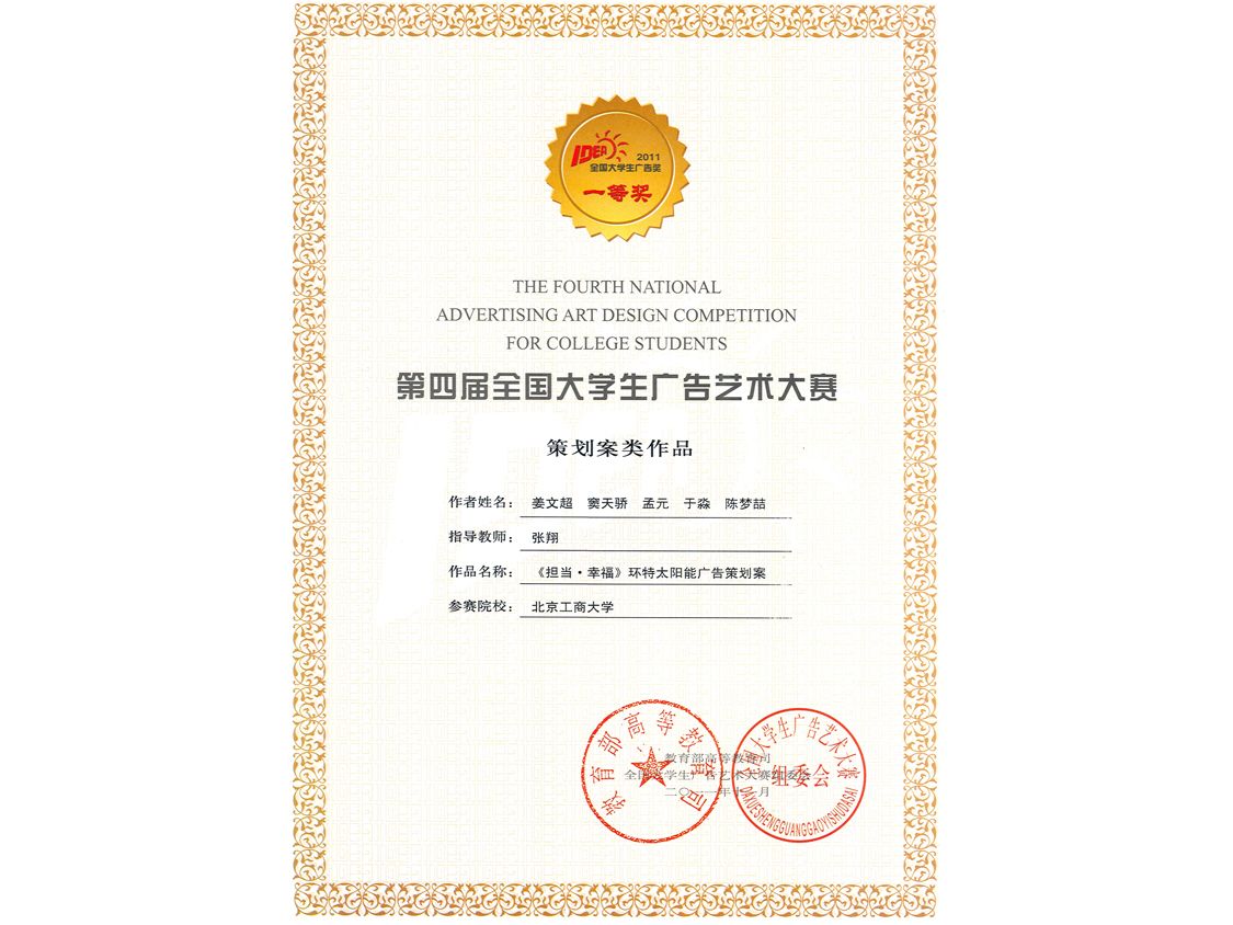11月19日,教育部主辦的全國大學生廣告藝術大賽頒獎典禮在人民大會堂隆重舉行,歷經近一年時間的比賽盛事落下了帷幕。我校藝術與傳媒學院廣告學專業和廣告設計專業方向的姜文超、孟元、陳夢喆、竇天驕、于淼等5位同學組成的廣告策劃團隊的作品《擔當·幸福——環特太陽能熱水器廣告策劃案》榮獲該項賽事的廣告策劃類一等獎,由王曉雅、王海寧、付雯、于敬波、張博然等5位同學組成的廣告策劃團隊的作品《一路同行——露友健步鞋廣告策劃案》榮獲廣告策劃類三等獎,張翔教授獲得優秀指導教師獎。