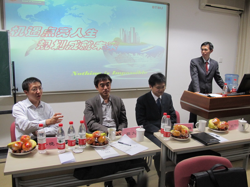 12月3日下午,經(jīng)濟(jì)學(xué)院金融系第一期“金融學(xué)專業(yè)大學(xué)生職業(yè)規(guī)劃講壇”在阜成路校區(qū)舉行。金融系邀請(qǐng)了中國(guó)建設(shè)銀行總行住房金融與個(gè)人信貸部高級(jí)經(jīng)濟(jì)師韓曉杰、中國(guó)工商銀行總行公司業(yè)務(wù)二部商品融資處副處長(zhǎng)周大偉、東北證券投資銀行部北京市場(chǎng)部副總經(jīng)理呂燦林和學(xué)生們廣泛交流觀點(diǎn)、分享入職經(jīng)驗(yàn),部分金融畢業(yè)班學(xué)生和研究生參加了講壇,講壇由該系金融教研室副主任張偉主持。