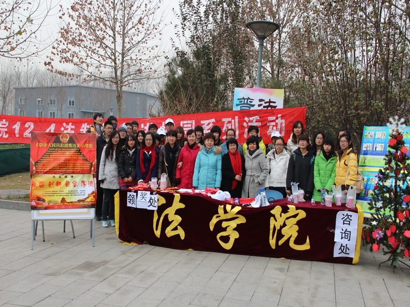在全國第十一個法制宣傳日來臨之際,為了認真落實“六五”普法規劃精神,掀起全校學生的學法高潮,營造濃厚的輿論氛圍,推進學校法治建設的進程,法學院策劃組織了“12·4”法制宣傳日系列活動,進一步推動普法工作的深入開展。12月6日中午,法學院舉辦的法制宣傳活動在學活門前廣場拉開帷幕。