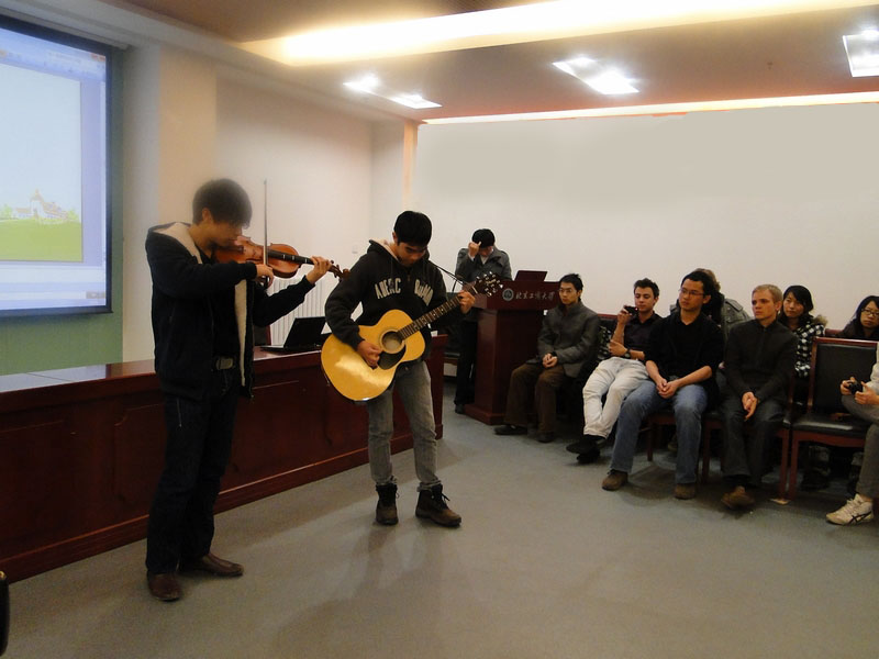 在接下來的互動環節中,留學生與我校研究生共同參與了猜英文單詞和搶凳子的游戲,游戲將整個活動帶進了十分熱烈的氣氛中。在節目表演環節,有來自新加坡的葉豪、岸鵬帶來的精彩吉他與小提琴合奏,新加坡顧敦杰同學演唱的具有中國特色的“青花瓷”。我校研究生徐冉的電子琴表演以及萬洋的葫蘆絲吹奏,都贏得全場同學們的陣陣叫好。精彩的節目引人入勝,大家都積極參與其中,留學生對音樂和舞蹈的熱愛使活動達到高潮。最后,我校研究生還為留學生們送上精心準備的小禮物,活動在輕松愉快的氛圍中圓滿結束。