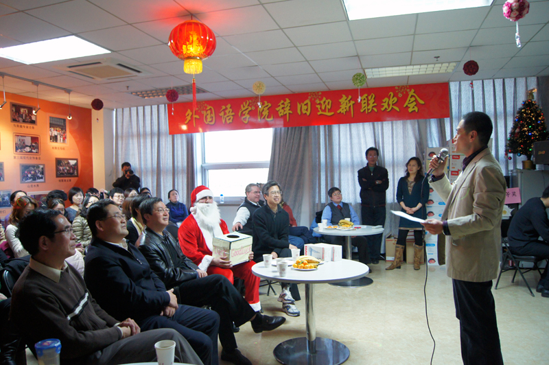 12月23日下午,圣誕前夕,外國語學院分工會在良鄉校區裝飾一新的工會之家舉辦了一場生動活潑、熱鬧非凡的辭舊迎新聯歡會。參加晚會的教職工達60余人,是外國語學院有史以來人數最多的一次。聯歡會由劉明宇、鄭昊霞兩位老師主持,學校黨委副書記兼工會主席張德玉、副校長李朝鮮也應邀參加了聯歡會。