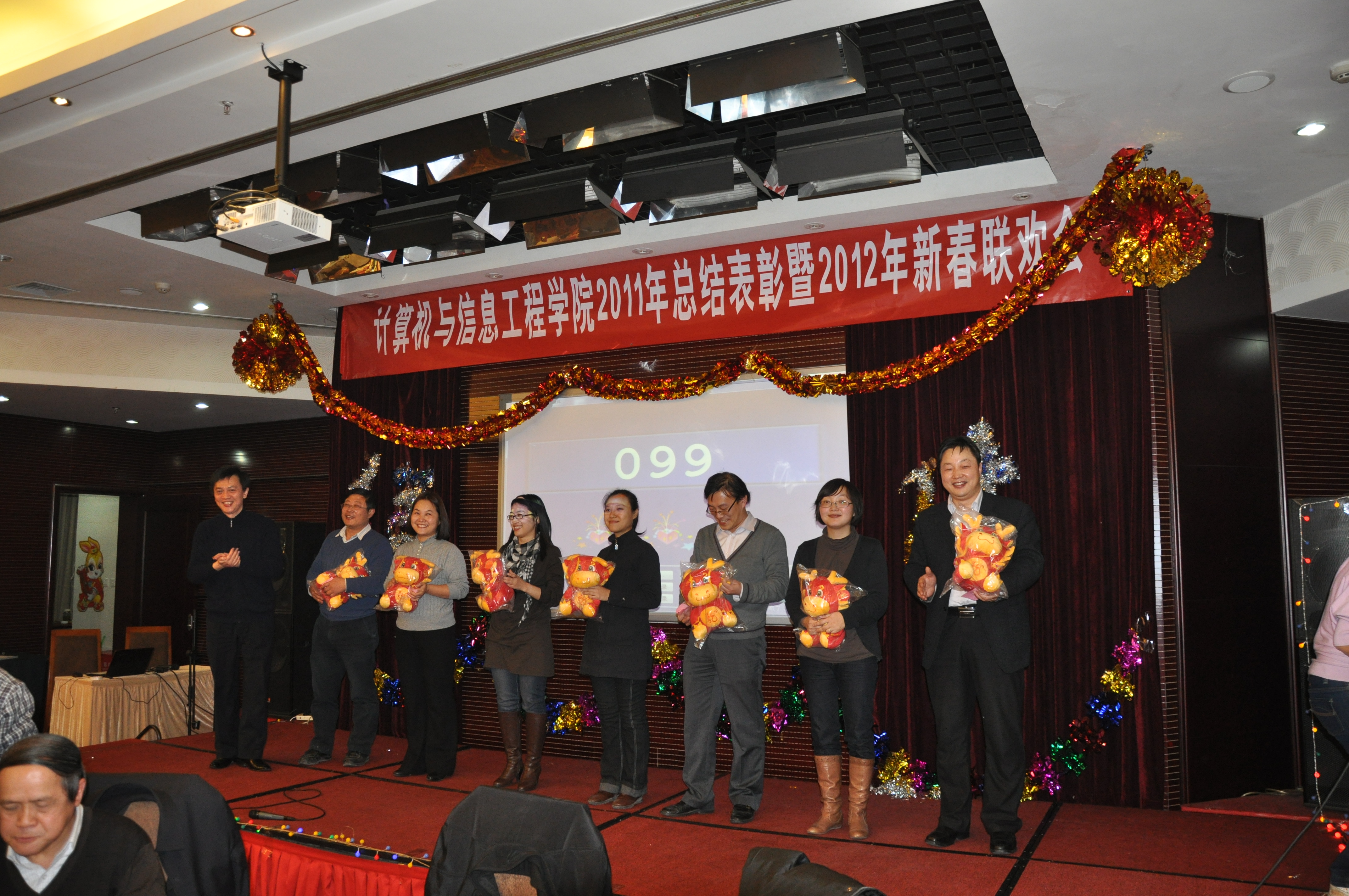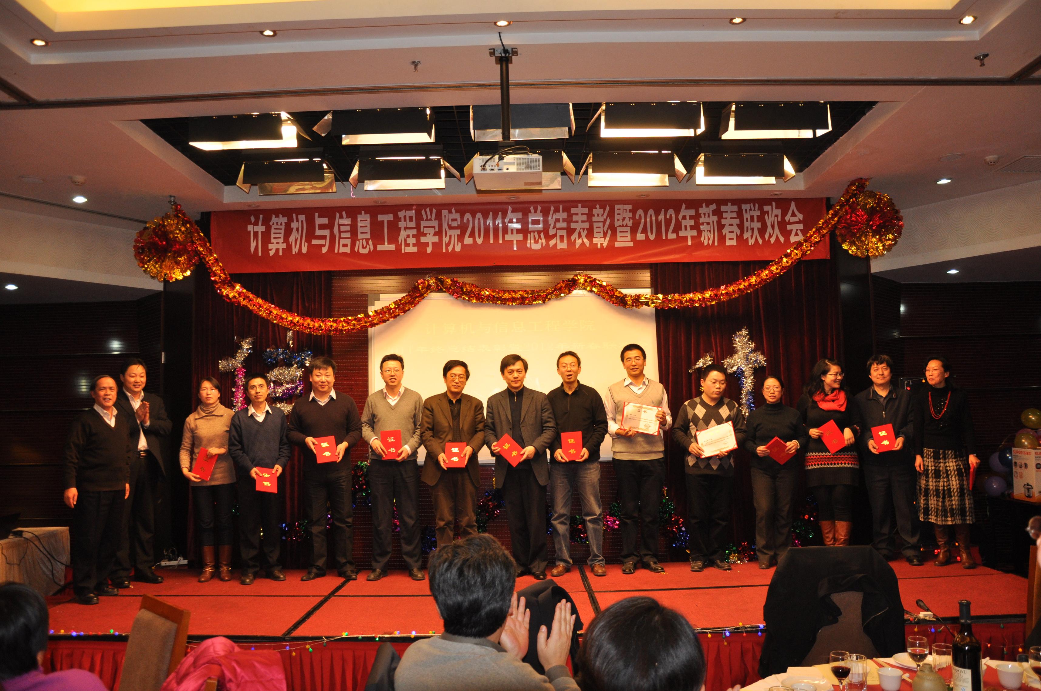 全體教師首先觀看了賀歲DV短片,短片回顧了2011年計信學院全體教職工積極努力、團結一心取得的各項驕人佳績。劉載文院長代表學院發表了熱情洋溢的講話,他簡單回顧了學院在2011年的成績與收獲,向大家過去一年來的辛勤工作表示感謝,并勉勵大家在新的一年里百尺竿頭,再創佳績。陳誼書記宣讀表彰決定,會議對2011年成績顯著的先進個人和先進集體進行了表彰。此次表彰共設八個獎項:教學成果獎、科研工作先進個人、學科專業貢獻獎、黨務工作先進個人、學科競賽優秀指導教師、優秀班主任、實驗室先進工作者、分工會活動積極分子。共計56名老師和2個系獲得了以上獎項。
