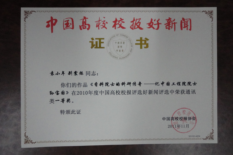另悉,在2011年北京高校校報好新聞評選中,袁小年、別震爍采寫的《孫寶國:“香料院士”的科研密碼》榮獲通訊類一等獎,袁小年、別震爍采寫的《孫寶國:打破國際壟斷的香料專家》榮獲通訊類二等獎。
