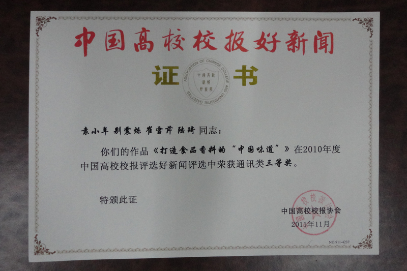 日前,中國高校校報協會2010年度中國高校校報好新聞評選結果揭曉,袁小年、別震爍采寫的《香料院士的科研傳奇——記中國工程院院士孫寶國》獲得通訊類一等獎;袁小年、別震爍、崔雪芹、陸琦采寫的《打造食品香料的中國味道》獲得通訊類三等獎。
