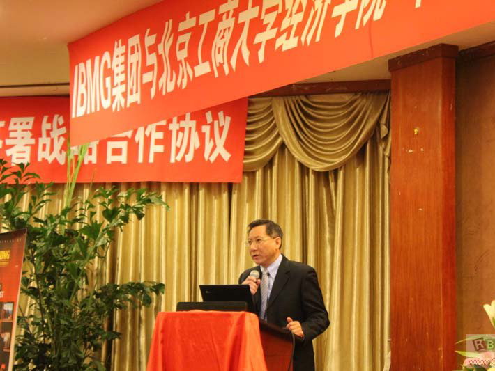 出席本次簽約儀式的嘉賓有北京工商大學副校長謝志華先生、 IBMG國際商業管理集團公司董事長李生先生、 IBMG國際商業管理集團執行總裁唐韶娟女士、IBMG公司執行總裁助理王全生先生、IBMG國際商業管理集團EMBA項目經理于民先生和北京工商大學經濟學院黨總支書記李寶仁、經濟學院副院長郭馨梅教授、經濟學院經貿系主任洪濤教授。