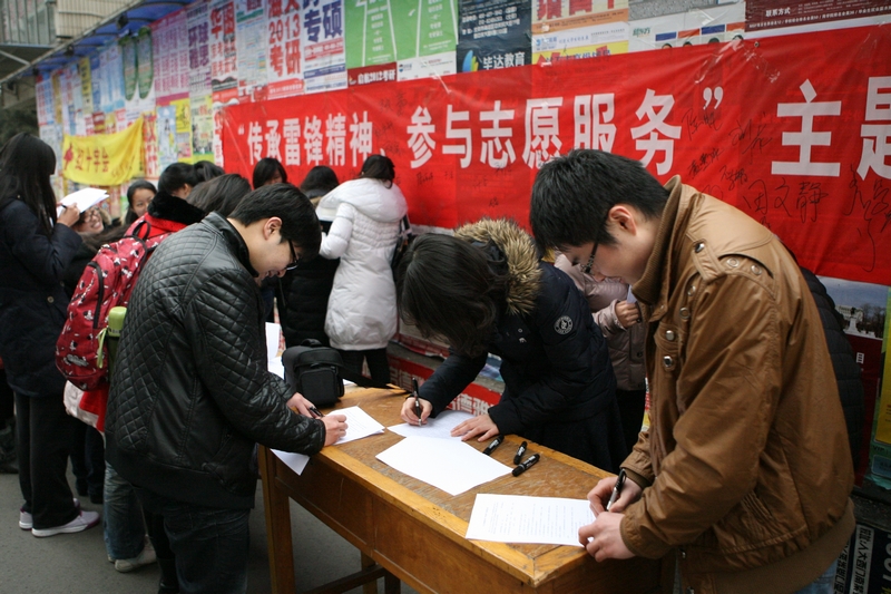 為響應學校 “學雷鋒、樹新風——2012年大學生志愿服務行動”號召,研究生部團總支在東區食堂門口專門設計了條幅簽名活動。每位駐足參與活動的同學都在條幅上鄭重簽下自己的名字,意味著大家發出了“從小事做起,投身志愿活動”的行動宣言。紅色的長條幅、端莊的文字,不僅是本次活動的宣傳口號,更是“雷鋒精神”的代表。一位受訪同學談到:“無論社會多么浮躁、功利之風如何盛行,對助人為樂、與人為善等道德價值的弘揚不能放棄,從小事做起,從身邊做起,積極投身志愿行動和公益活動是傳承新時期‘雷鋒精神’的最佳途徑。”