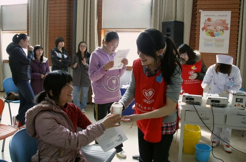 3月23日早,隨著鐘樓敲響八聲,喚醒朝陽下的校園,以“弘揚雷鋒奉獻精神、光榮獻血人道互助”為主題的2012年春季無償獻血活動在良鄉校區學生活動中心多功能廳正式開始。 本次獻血活動由學生處、校紅十字會及校醫院聯合發起,北京市紅十字會血液中心派獻血車及工作人員來我校進行校園采血。來自理學院、商學院、法學院、外國語學院以及其他各院的同學們紛紛自愿前來參與了獻血。 服務貼心 獻血放心 學活多功能廳門外擺放了介紹獻血知識的宣傳板,門上懸掛寫有“弘揚雷鋒奉獻精神光榮獻血人道互助”的橫幅。走進多功能廳,獻血工作開展得井然有序。 前來獻血的同學先在咨詢臺領取一張表格和由北京市獻血辦公室印發的獻血指南,填寫完個人基本信息后到體檢處檢查體重、血壓和血型,待檢驗結果出來,各項指標合格后就可以獻血了,最后到登記處登記并領取獻血證,獻血完成,整個過程不到20分鐘。 后勤處早早調試好了多功能廳的空調溫度,校醫院的大夫也在隨時關注同學獻血后是否有不良反應。學校、學院為獻血的同學準備了食品、糖水,市血液中心為獻血者帶來了面包、飲料和小紀念品。 此次獻血活動的學生志愿者有近70名,匯集了校紅十字會、校青年志愿者協會和自發前來志愿的同學們。數媒111、112兩個班的團支書更是組織了全班同學來做志愿者。他們佩戴條幅或身著紅色馬甲,引導、分發表格、送糖水和面包……每個環節都有他們微笑服務的身影。 參與獻血 人人光榮 本次獻血活動中,同學們的參與熱情很是高漲,很多同學早早就在多功能廳外等候,工作剛剛開始時,等待獻血的人更是排起了長隊。獻血活動從8:00持續到了12:45,據統計,在這四個多小時中,共有175名獻血者成功獻血。 第一個獻血的同學是英語112班的班長張璐。事實上,她的媽媽早上八點就要在大興醫院做良性腫瘤切除手術,她一早過來獻血,獻完就匆忙離開了。她堅持獻血的原因不得而知,但她這第一份紅色的禮物,卻給聽到這背后的故事的每顆心注入一股暖流。 十點十分,血液化驗處旁邊,工商111班的郁斌磊在焦急地等待著血液化驗結果。“獻血不怕,我就怕血檢不過。”他說:“來獻血是實現小時候的夢想,我很早就想獻血了,因為未滿18歲一直都不能獻。我也想‘為人民服務’,獻點血算是做到了一半吧。”絕大部分獻血的同學都是剛滿18周歲,第一次獻血就成了他們成年紀念簿上最有意義的一筆紀錄。 在獻血等候席的角落,記者無意發現了學校云南過橋米線店的老板娘孟立娜。她告訴記者,自己前年11月也在這里獻過一次血,她的弟弟也很想過來,但店里的活實在太忙了,家人都抽不出空來。當被問及為什么總惦念著獻血時,她說得很簡單:“對自己好,也對大家都好。” 北京市紅十字會血液中心的曹慶盛大夫介紹說:“北京的醫療資源相對集中,手術量大,平時的用血就比較緊張,而每年的3月和11月是獻血的淡季,血液供求就有缺口。所以每年血液中心都會與高校合作,把獻血車開進校園,宣傳和鼓勵同學們義務獻血。” 老師帶頭 快樂獻血 校黨委副書記盧思鋒百忙中兩次來到獻血會場,在校紅十字會的志愿者的引導下,參觀了整個獻血流程,與血液中心的工作人員交流,和在場的老師、同學愉快地談話。 學生處的徐紅京老師、王濤老師和法學院的文四英老師也加入了同學們的隊伍,帶頭獻血。徐紅京老師告訴記者,自己平常一直注意鍛煉,身體很好,但是明年他將超過可以獻血的年齡限定,這是他最后一次能獻血了。王濤老師已經獻血四次了,近三年每年都參加了學校組織的獻血活動,不僅自己帶頭獻血,她還忙著組織協調其他師生獻血,得到校醫院老師的贊譽時,她也只說:“這是應該的。” 理學院黨總支書記田宏、商學院黨總支副書記褚才寬、外國語學院黨總支副書記楊秀萍也來到獻血現場,自始至終陪伴著同學們,一同體驗奉獻的快樂。每年的獻血活動都得到了各個學院的大力支持。各院積極向學生普及獻血知識、宣傳獻血政策,鼓勵義務獻血。理學院的田宏老師說:“我們宣傳的重點是要讓學生了解獻血、不怕獻血,做到‘獻血:全知道,純自愿’。” 獻血結束后,學校及各院的領導、老師,北京市紅十字會血液中心的全體醫務人員和本次活動的志愿者們在學生活動中心門前合影留念。北京工商大學2012年春季無償獻血活動圓滿結束。