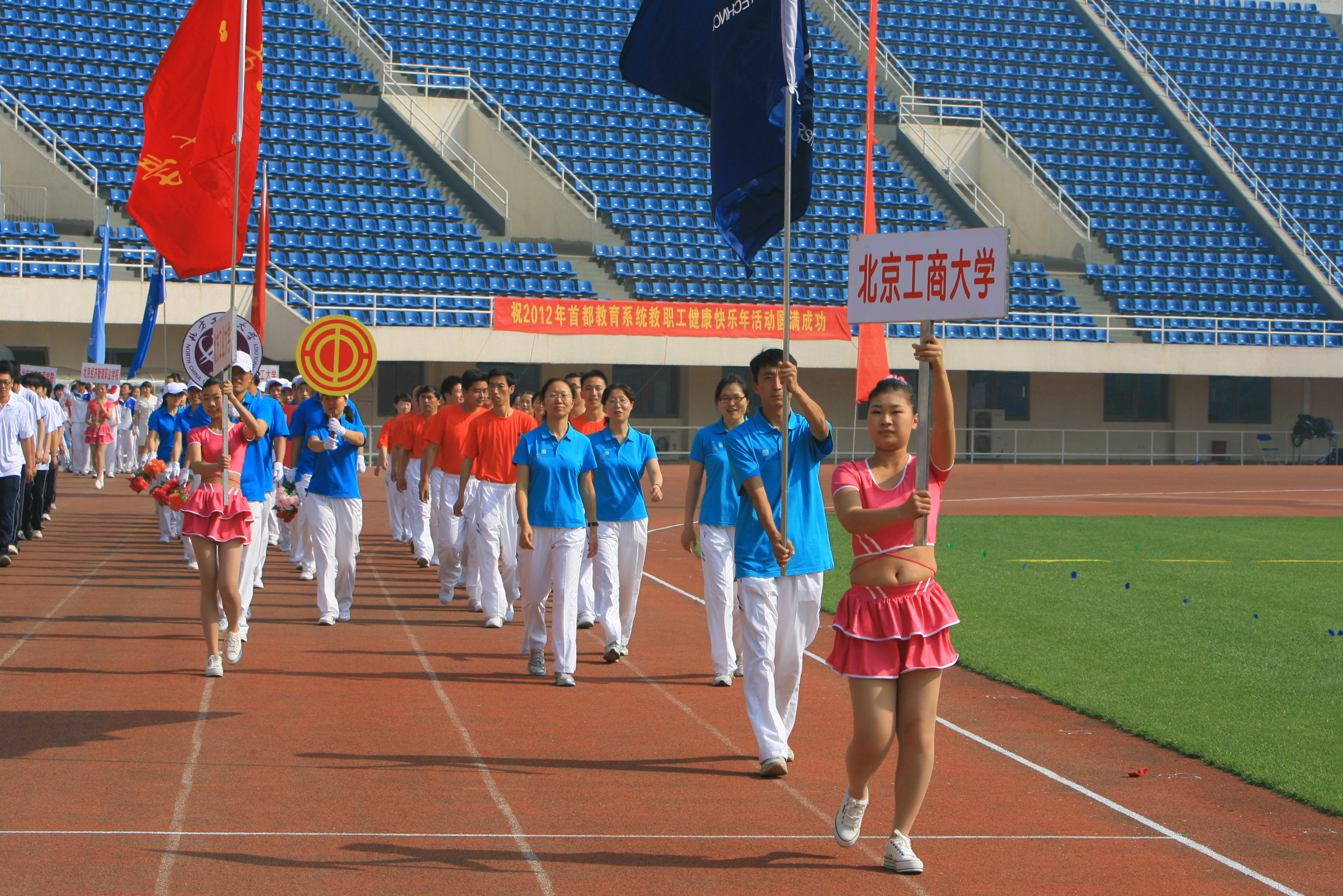 2012年首都教育系統教職工運動會由中共北京市委教育工作委員會、北京市教育委員會、北京市教育工會主辦,首都體育學院承辦,歷時兩個月,得到全市教育系統教職工的廣泛支持和積極參與。上萬名教職工參與了籃球、羽毛球、乒乓球、游泳、圍棋、象棋、橋牌、田徑趣味、廣播操、太極拳等十個項目的比賽。我校參加了除棋牌項目之外的其他所有項目,在此前的九項比賽中,我校在高校甲組32所學校中取得總分排名第12的好成績。