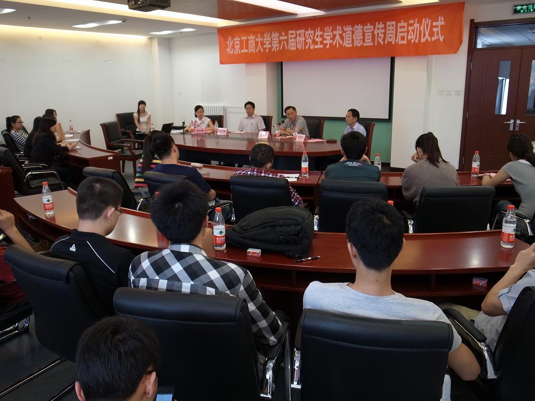 6月1日上午,在阜成路校區舉行了第六屆研究生學術節系列活動之學術道德宣傳周啟動儀式。本次學術道德宣傳周活動由研究生會和青年廉潔自律促進會(簡稱“青廉會”)聯合主辦,旨在倡導廣大研究生自覺抵制學術不端和學術失范行為,弘揚積極向上的學術風氣。謝志華副校長應邀出席并講話,參加啟動儀式的有研究生部主任楊德勇和校法律顧問徐康平,以及相關老師和研究生代表50余人。