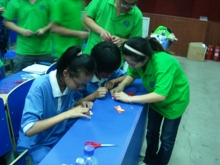 到達實踐基地后,團員們與中學生一一對接,進行了第一項活動——破冰行動。在彼此的介紹中,團員與中學生們建立了良好的關系。為促進彼此關系,團員們還專門進行了一系列的小游戲,例如:“我愛記歌詞”,“100秒不NG”。在歡聲笑語中,大家的關系變得更加的融洽。之后的藝術課,團員們教小朋友們系中國結,疊紙塔、疊紙籃,充分鍛煉了小同學們的動手能力。