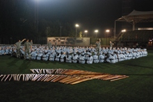 夜幕降臨,同學們這一天的任務卻并未結束,一個小時的休息時間后伴著嘹亮整齊的口號聲,他們又回到訓練場繼續訓練。隨后教官表演則讓同學們輕松了不少,孔武有力的擒敵拳和優美的軍歌讓勞累了一天的同學們身心都得到了放松。