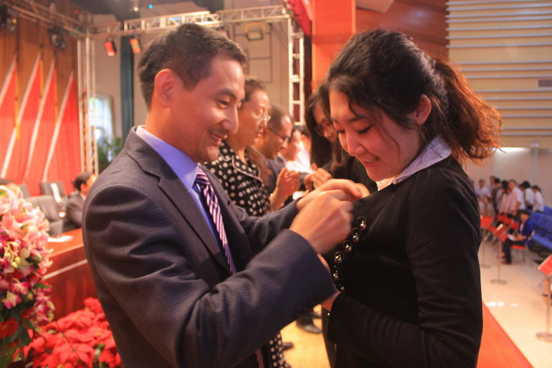 接下來八個學院的院長依次寄語在場的所有研究生,院長們希望新生同學們明確目標、勇于超越、快樂學習、健康成長,成為德才兼備的人才,留下美好的人生回憶,之后分別給各學院研究生代表佩戴了校徽。
