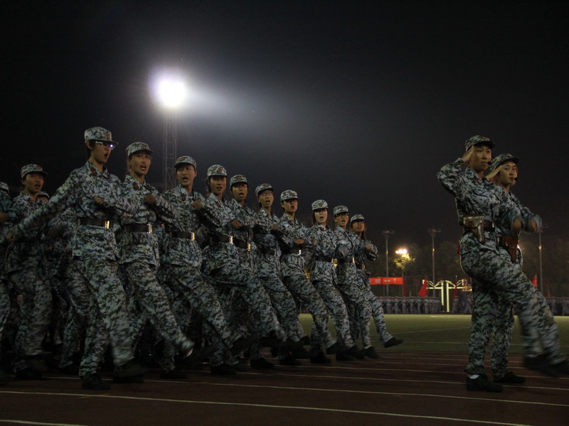 緊接著,由324名男、女同學組成的三營隊列方隊,朝氣蓬勃、步履鏗鏘地向主席臺走來。隊列表演整齊劃一、有條不紊,以高低有序的隊形組成五角星亮相,并擺出數(shù)字“22”,代表參加此次軍訓的22個連隊。與此同時,下蹲、起立、敬禮、整理衣帽的連貫動作,加上精心編排的伴奏音樂,以及反復播放的歌詞“1、2,1、2”,展現(xiàn)了新生們斗志昂揚的精神風貌。