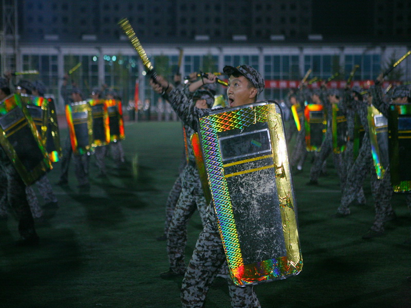 最帶給人驚喜的是警棍盾牌操的表演。精心裝飾的金色盾牌和警棍迎著全場的燈光,耀眼奪目、熠熠生輝。同學們攻擊和防御的每個動作準確到位,用警棍敲擊盾牌的聲音也震耳欲聾,既表現(xiàn)了大學生的青春朝氣,又展現(xiàn)了他們此刻作為一名“軍人”的颯爽英姿。