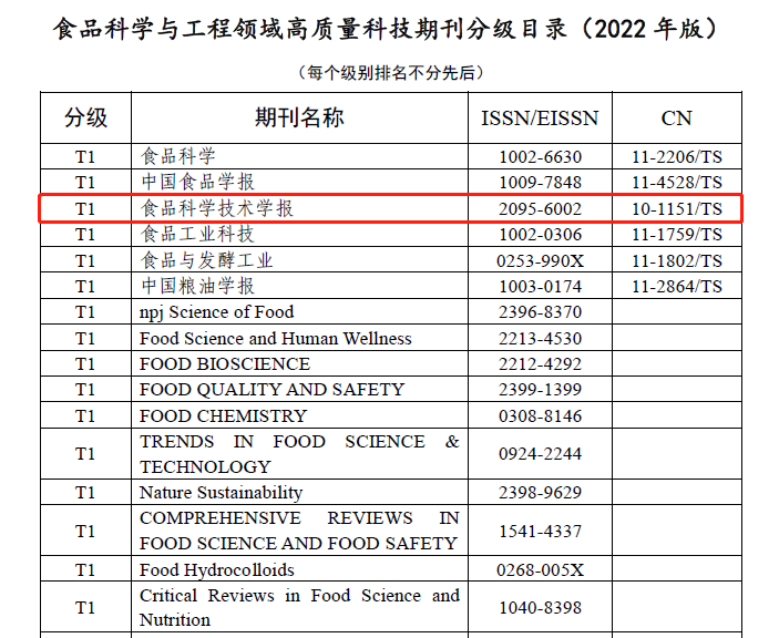 近日,由中國科協(xié)統(tǒng)一部署,我國首次面向全球食品科技期刊開展分級認(rèn)定的《食品科學(xué)與工程領(lǐng)域高質(zhì)量科技期刊分級目錄》(以下簡稱《分級目錄》),在中國食品科學(xué)技術(shù)學(xué)會官網(wǎng)正式發(fā)布,其中由我校主辦的《食品科學(xué)技術(shù)學(xué)報》入選《分級目錄》第一方陣,即T1類。