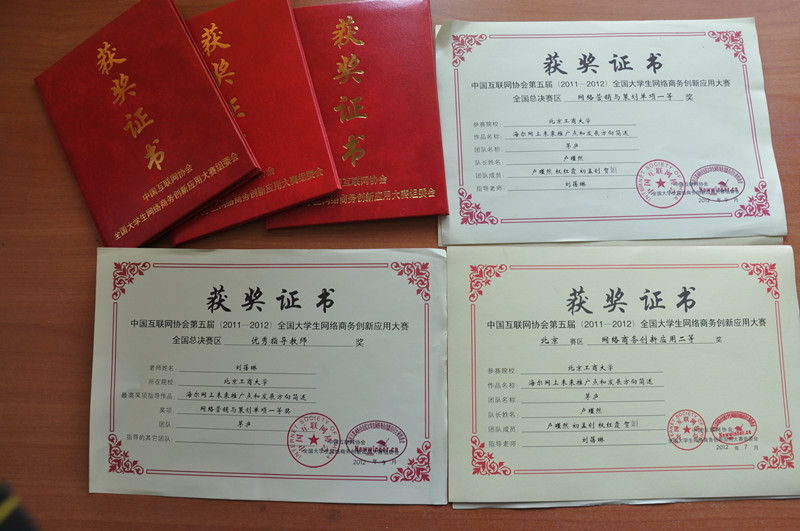 計信學院對全國大學生網絡商務創新應用大賽高度重視,本次共組織了五個隊參加比賽。在劉蓓琳老師的認真指導和同學們的努力下,由初孟釗、付啟超、董超、唐樂、劉巖同學組成的取信天下隊獲得北京賽區網絡商務創新應用二等獎,由初孟釗、賀姮、盧瑾然、權紅霞同學組成的茅廬隊通過網絡評選和專家投票,殺入全國總決賽,最終獲得了全國總決賽網絡營銷與策劃單項一等獎的好成績。