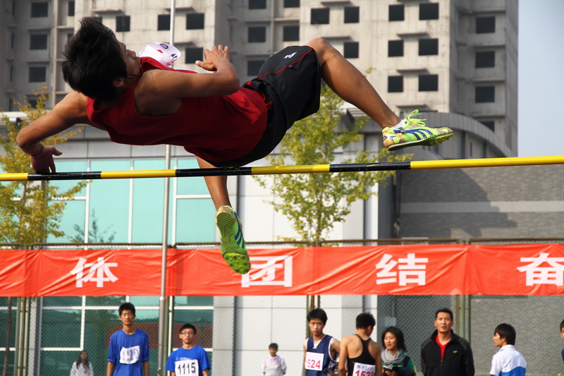 跳高賽場正在進行激烈的角逐。助跑、起跳、騰空、落地,運動員們一系列連貫動作,在空中留下道道優美弧線和完美的轉身。