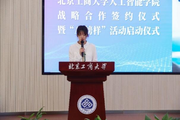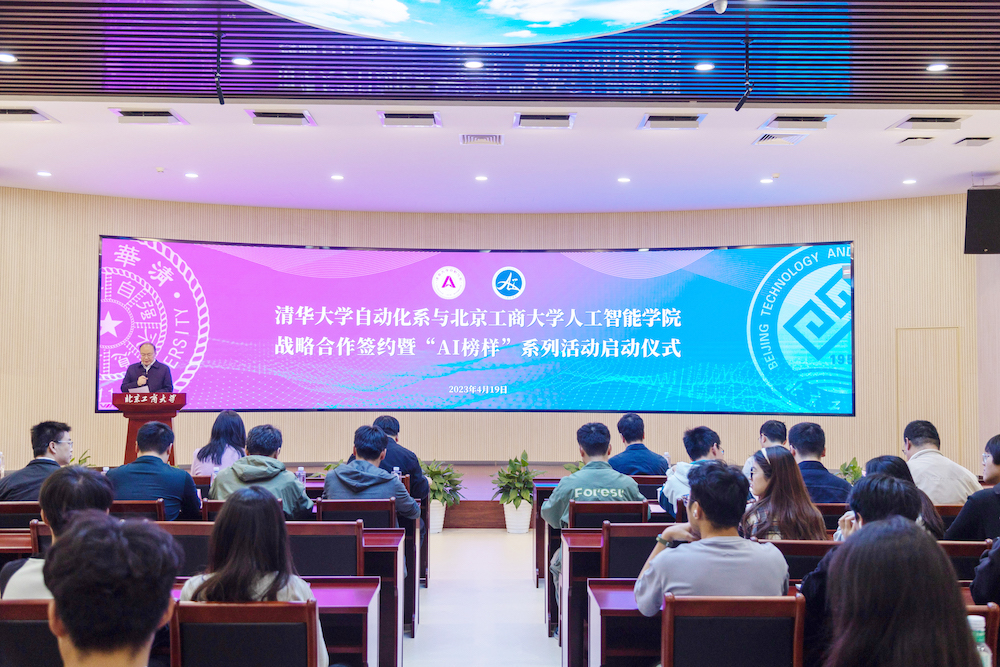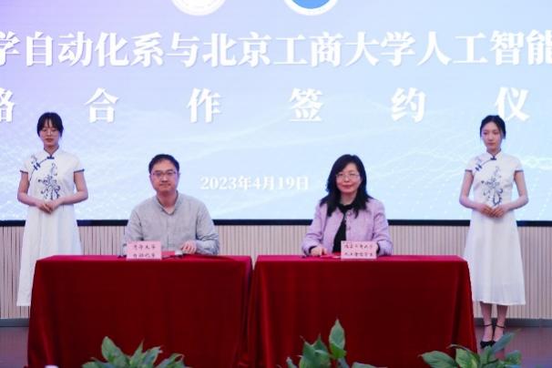 清華大學自動化系黨委副書記古槿與北京工商大學人工智能學院院長于重重進行簽約。戰略合作簽約儀式由人工智能學院黨委書記黃志剛主持。清華大學自動化系黨委學生組組長尚超與北京工商大學人工智能學院副院長李剛一同為“智動”學生發展中心揭牌。