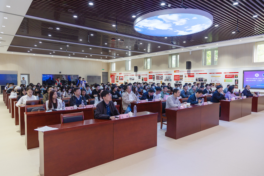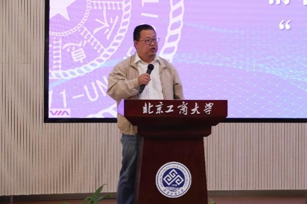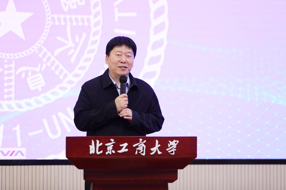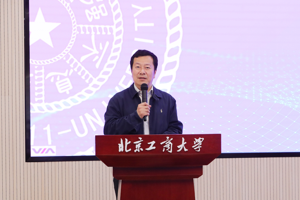 清華大學自動化系主任張濤致辭。他表示,這是他第一次走入北京工商大學良鄉主校區,欣喜的是兩校除了教師之間的交流,也逐步開展學生層面的活動。此次隨行的清華大學學生包括了系團委書記、學生骨干和科協會長等,希望可以深入交流,進一步探索合作方向。他表示,清華大學自動化系和北京工商大學人工智能學院關系緊密,目前自動化專業也逐漸將傳統控制與人工智能相結合,守正創新。相信北京工商大學人工智能學院隨著系統科學博士點的建設及博士生數量的增加,會培養出更多優秀人才,成長出更多杰出校友。他希望,未來雙方能夠一起努力,在科學研究、人才培養等方面開展更廣泛更深入的合作。