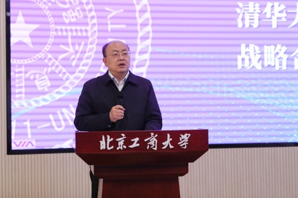 劉敏華在致辭中向與會嘉賓致以誠摯謝意,回顧了北京工商大學發展的三個階段,展示了學校第三次黨代會描繪的宏偉藍圖,闡述了未來學校的奮斗目標。他指出,在學校“食品進全國前三、商科數字化轉型”的發展戰略目標下,人工智能學院師生一定要抓住機遇,以數字化、信息化、智能化為突破口,賦能工科與商科,推動學校“雙一流”創建工作,全面開創高水平研究型大學建設的新局面。他感謝張濤主任親自帶隊來學校進行考察并指導工作,強調清華大學自動化系底蘊深厚,師資力量雄厚,是我國自動化領域高水平人才培養和科技創新的基地和高地。自去年以來,學院已經多次得到過指導和幫助,通過首屆系統科學博士生課程建設、邀請清華大學教師講授自動控制原理課程、邀請清華教師參加復雜系統建模與分析系列講座等活動,奠定了雙方合作的基礎。他希望,此次戰略合作簽約儀式可以實現戰術落地,以實干精神推動雙方務實合作,促進人工智能學院發展,產出更多合作成果。