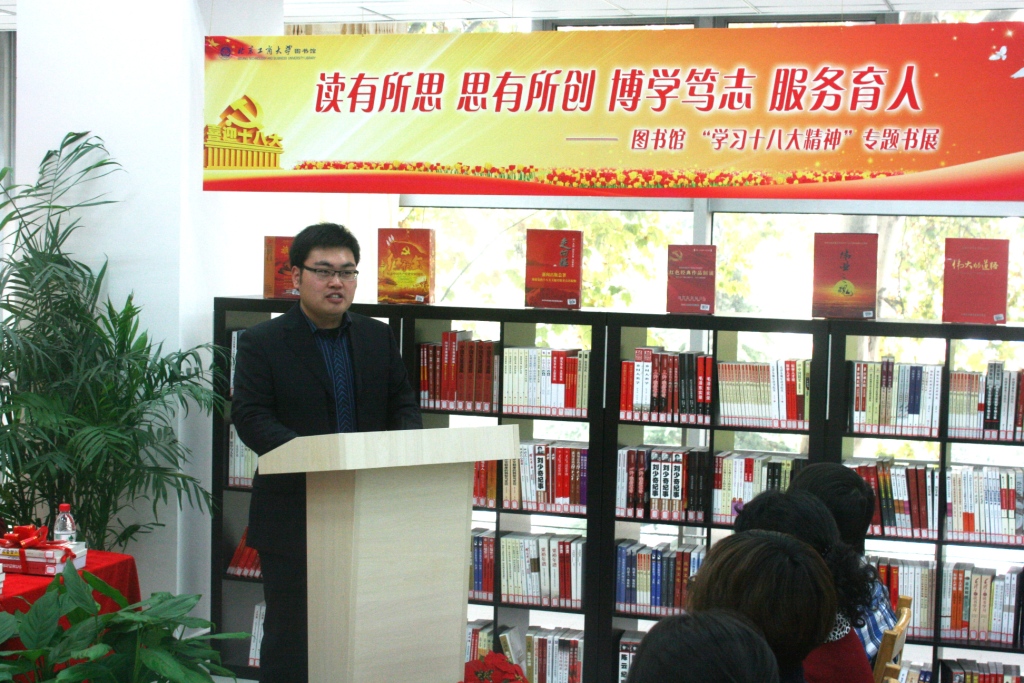 盧思鋒副書記對圖書館為開展本次活動所做的大量工作給予了充分肯定,他說,在黨的十八大結束后,圖書館及時推出專題書展活動,為配合學校開展對十八大精神的學習和貫徹工作發揮了積極作用。他指出,圖書館是學校及社會文化傳承的重要場所,書籍是人類社會進步的階梯,我校圖書館全體館員盡職盡責、任勞任怨,為給廣大讀者創造良好的學習環境和完善的信息服務做出了不懈努力,并為勤工助學同學提供了大量工作和鍛煉的機會,較好地體現了圖書館的服務職能和教育職能。希望同學們充分利用圖書館的資源和服務,博覽群書、開拓眼界,為國家多做貢獻,同時也希望學校各相關部門為圖書館的建設和發展提供更多的支持與幫助。