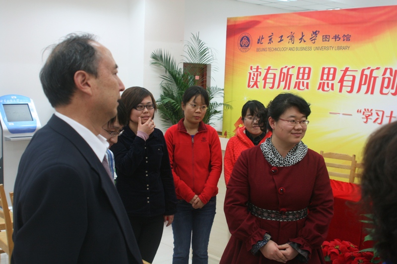 為認真貫徹落實“十八大”會議精神、熱情謳歌黨的光輝業績、加快推進學習型基層黨組織建設、引導師生多讀書、讀好書, 11月20日下午,圖書館在阜成路校區舉行了以“讀有所思、思有所創、博學篤志服務育人”為主題的“學習十八大精神”專題書展暨讀書會啟動儀式。學校黨委副書記盧思鋒、組織部部長兼機關黨委常務副書記董竹娟、宣傳部部長張春萍、學生處處長呂素香、組織部副部長兼機關黨委副書記鄭喜姣、圖書館全體共產黨員及學生代表參加了啟動儀式。儀式由圖書館黨支部書記李艷芬主持。