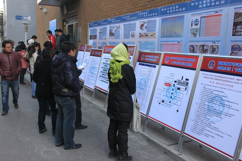 9點,譚向勇校長、張耘副校長在校辦主任王小藝、研究生部主任楊德勇、副主任張正平等陪同下巡視考場,并慰問考務工作人員。北京市教育考試院有關領導也親臨我校視察和指導工作。在學校領導的統籌指揮和各有關單位的協調配合下,整個考務工作有條不紊,各考場紀律嚴肅,秩序井然。