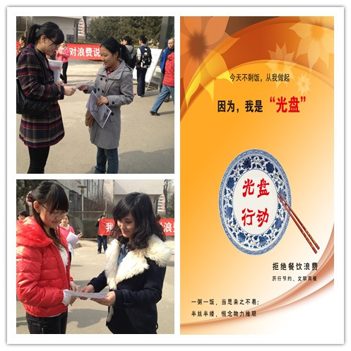 3月5日,食品學(xué)院團(tuán)總支在阜成路校區(qū)東區(qū)食堂舉辦“學(xué)雷鋒 愛(ài)環(huán)保——今天不剩飯從我做起”活動(dòng),號(hào)召大家勤儉節(jié)約。無(wú)論是精心設(shè)計(jì)的主題為“光盤(pán)行動(dòng)拒絕舌尖上的浪費(fèi)”的海報(bào),還是在食堂門(mén)口向全校師生分發(fā)的號(hào)召 “光盤(pán)行動(dòng)”的宣傳單,都在溫馨地提醒大家拒絕浪費(fèi),形成人人節(jié)約糧食的良好校園風(fēng)氣。此外還號(hào)召大家發(fā)揚(yáng)節(jié)約糧食的優(yōu)良作風(fēng),從我做起,天天不剩飯。