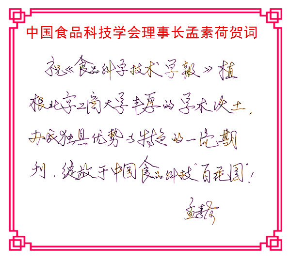 本次學報的更名工作是在校領導的關心、支持和幫助下以及科技處的努力下所取得的重大進展。在學報獲準更名之際,國內食品行業的院士、專家、學者紛紛發來賀詞及寄語,祝愿《食品科學技術學報》成為食品領域學術交流的重要載體、人才培養的重要平臺、產業發展的重要支撐。