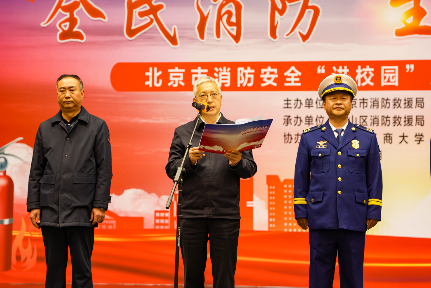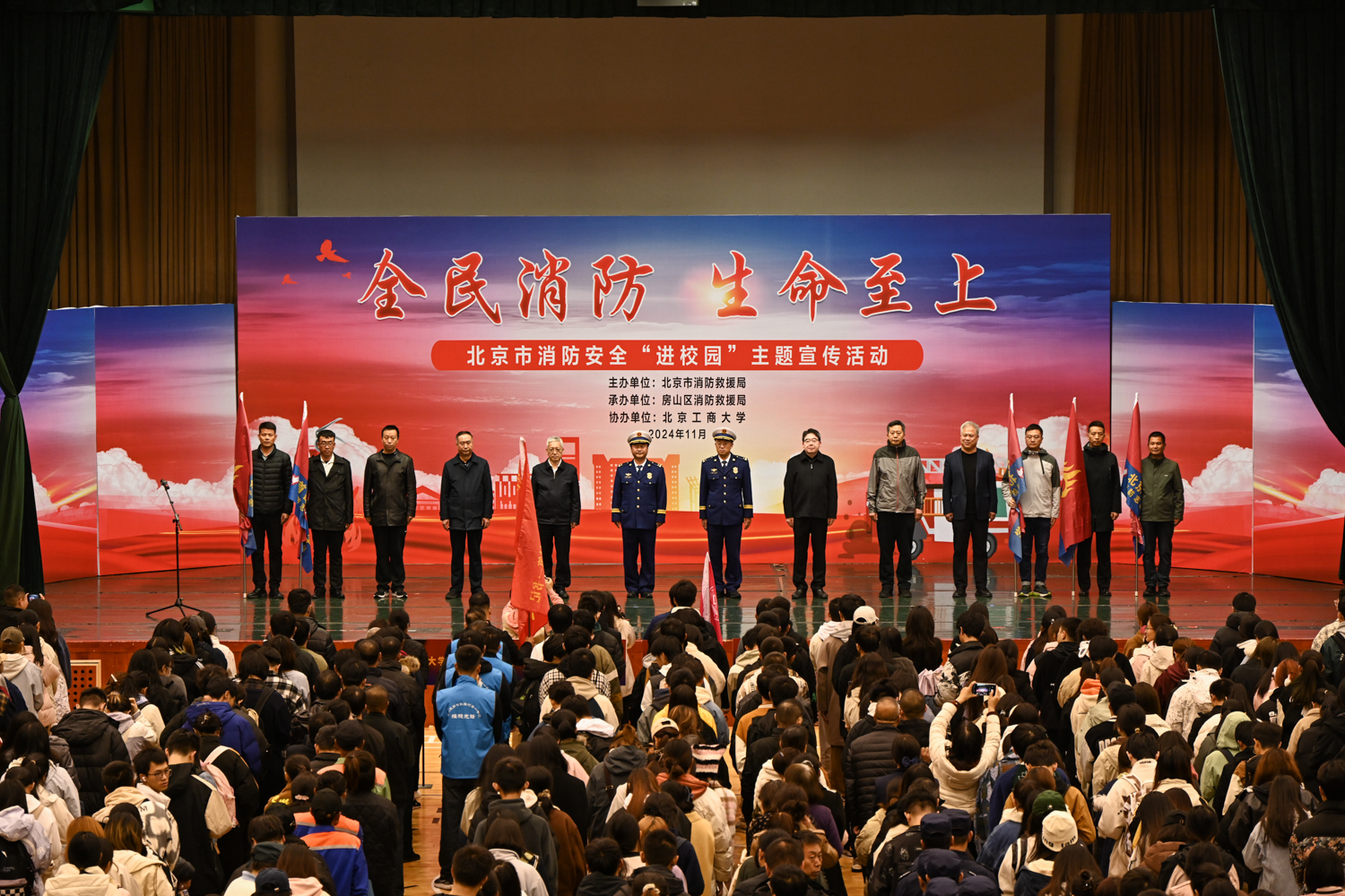 11月13日下午,北京市消防救援局在學校良鄉主校區文體館舉辦消防宣傳“進校園”暨消防宣傳月系列活動。此次活動以“全民消防,生命至上”為主題,旨在提高師生消防安全意識,增強校園火災防控能力。學校黨委副書記李中奇出席活動,市消防救援局、房山區消防救援局、良鄉大學城管委會、北京工商大學、北京中醫藥大學、北京理工大學、首都師范大學和中國社會科學院大學、北京消防志愿服務總隊志愿者代表、房山區各消防志愿服務隊志愿者代表、高校學生代表和社會各界及群眾代表約1000人參加了活動。