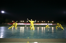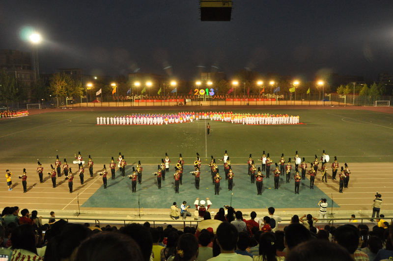奏樂聲起,校管樂團的行進管樂表演響徹全場。管樂團的同學們身著亮麗的制服,在快速隊形變換同時進行音樂演奏。表演的四首作品由四支搖滾樂隊的成名歌曲改編而來,并在一次次的隊形變換當中展現了?;蘸拖笳髦ㄐH掌诘?span lang="EN-US">1950等圖案,表演充滿動感和視聽沖擊力。