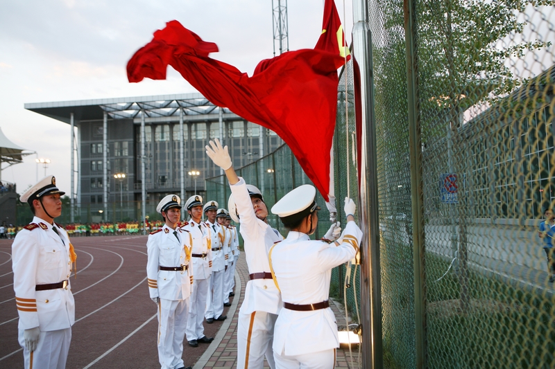 矯健的身姿,鏗鏘的步伐,雄壯的國歌聲中五星紅旗徐徐升起,開幕式正式拉開帷幕。