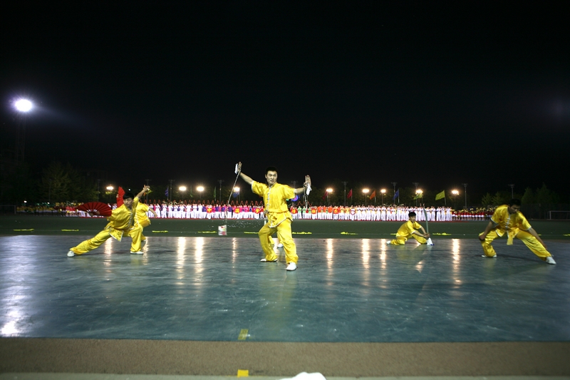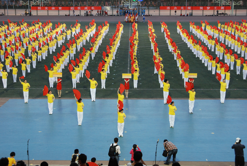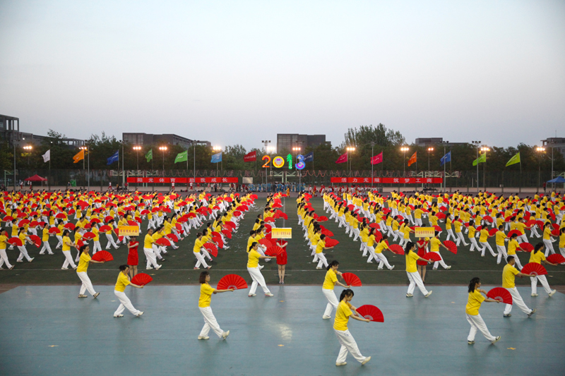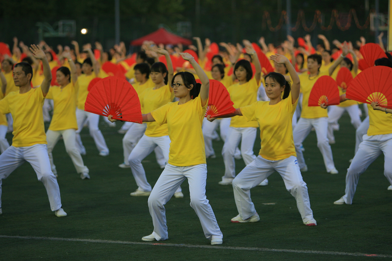首先上場的是教職工帶來的《中國功夫》太極扇表演。三尺講臺上的老師們今天也踏上了運動場,來自學校14個分工會的近700名教職工身著黃色上衣、白色運動褲,手持紅色舞扇,豪情萬丈,一招一勢盡展功夫氣魄。太極扇表演在剛柔之間展現 “快樂健康,幸福生活”的理念,近三個月來,各分工會認真組織,積極練習,老師們逐漸體會到了太極扇的韻味和樂趣。整齊的動作、颯爽的英姿展示了北工商教職工別樣的風采,鮮紅的折扇揮舞出壯麗的美景,精彩的表演激起了現場陣陣的掌聲。