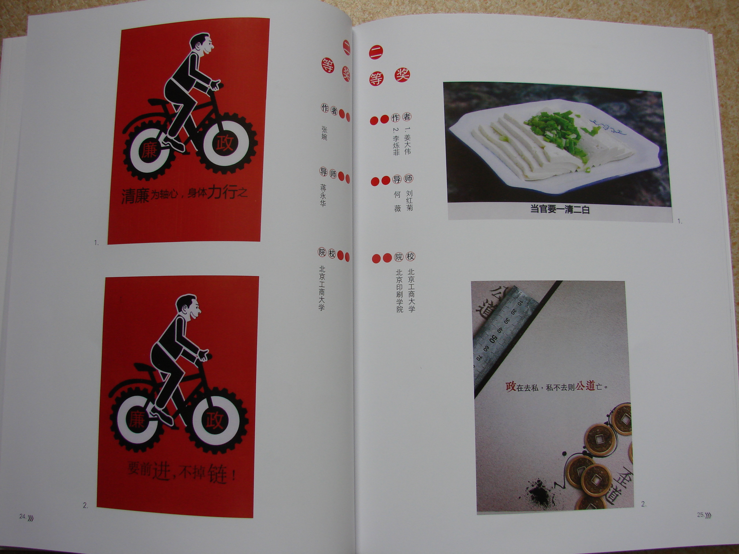 此次大賽是北京市教育紀工委在2012年為學習貫徹黨的十八大精神,深入推進校園廉政文化建設工作,以弘揚北京精神、宣傳廉潔理念、傳播廉政文化、褒揚勤廉風范、鞭撻腐敗現象為主要內容所開展的一項大型宣傳教育活動。大賽共收到來自北京17所高校的招貼創意設計作品1239幅,組委會聘請了專家組成評委會,經匿名評審,共評出優秀作品200幅,分獲一、二、三等獎,并將獲獎作品匯集成冊,下發各單位學習交流。