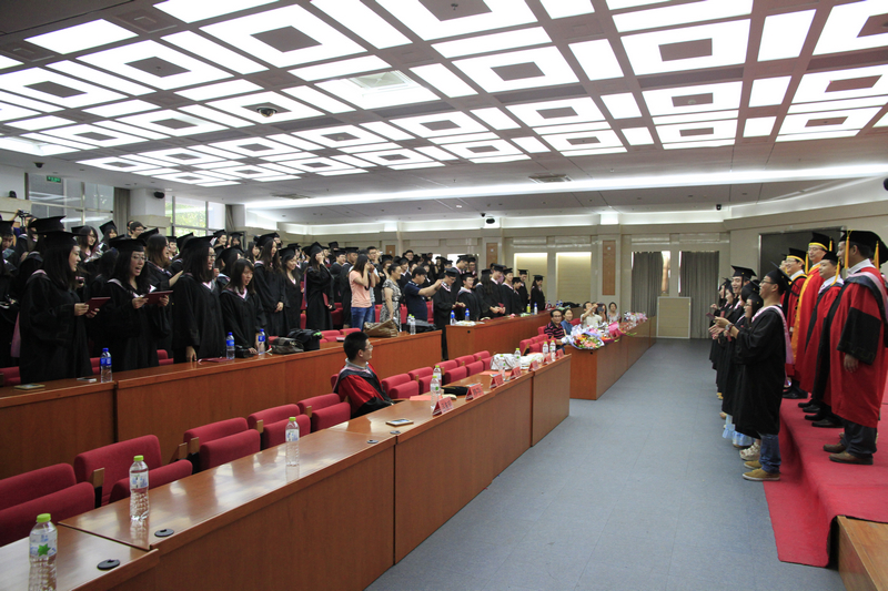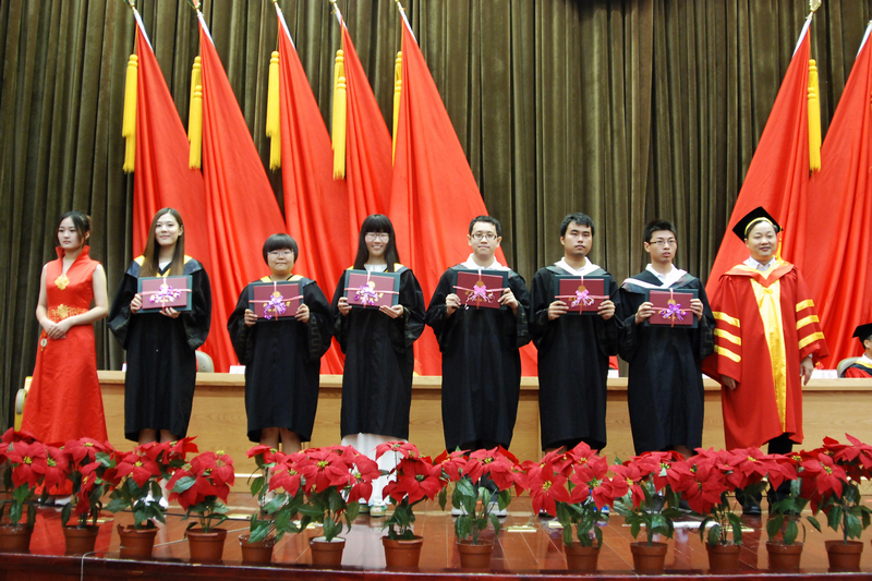 畢業生們逐一接受了在場領導和導師們的扶蘇,在“求真、立德、勤奮、創新,做好人,做有用人,做成功人”的高呼聲中,畢業生們將學士帽高高拋向空中,放飛夢想。