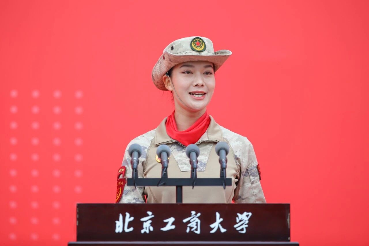 法學院退伍大學生陸俊卉作為在校生代表,分享了作為民兵方隊隊員參加九三閱兵的珍貴經歷。她動情回顧了193天高強度的隊列訓練的艱辛與堅持,并表示,是偉大的抗戰精神和師長的支持讓她最終昂首走過天安門。她結合自身從軍人到學生的轉變,闡述了當代北工商學子應具備的四種風采:心懷家國的愛國情懷、堅守誠信的民族氣節、迎難而上的英雄氣概和融通發展的必勝信念。她呼吁學弟學妹們珍惜時光、自律自強、勇于挑戰,將“工商一體化”的理念轉化為綜合競爭力,在實現民族復興的賽道上奮力奔跑。