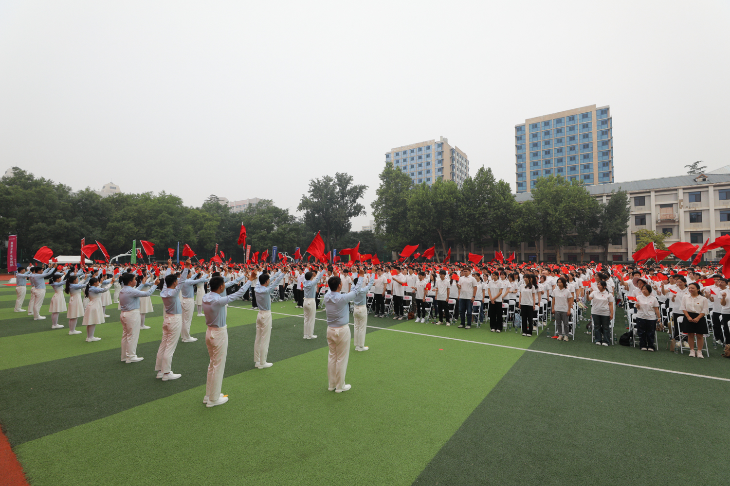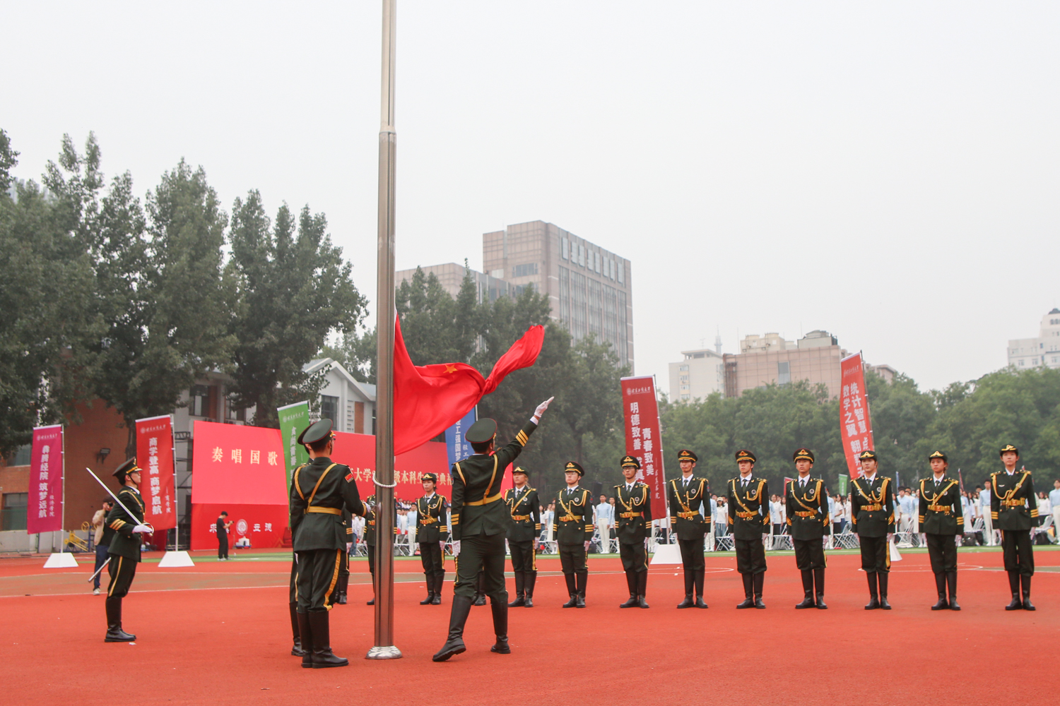 國旗護衛隊邁著整齊的步伐入場。在莊嚴的國歌聲中,鮮艷的五星紅旗冉冉升起,全體師生肅立齊唱,表達對祖國的無限熱愛與崇高敬意。
