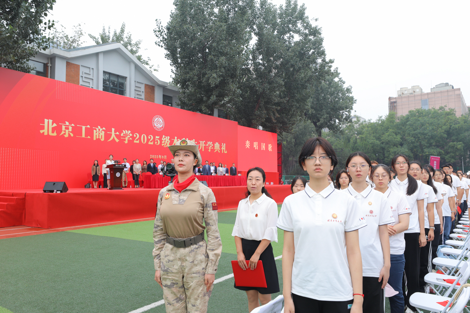 今年是中國人民抗日戰爭暨世界反法西斯戰爭勝利80周年,這堂“開學第一課”也是新生們的“紅色第一課”。典禮前,師生集體觀看《銘記歷史 勇擔使命》北京工商大學紀念中國人民抗日戰爭暨世界反法西斯戰爭勝利80周年專項活動紀錄片,紀錄片展現了我校200余名師生員工服務保障九三閱兵的光榮事跡。回顧了師生們圓滿完成廣場合唱團、志愿服務兩個專項任務,不負黨和人民賦予的神圣使命。